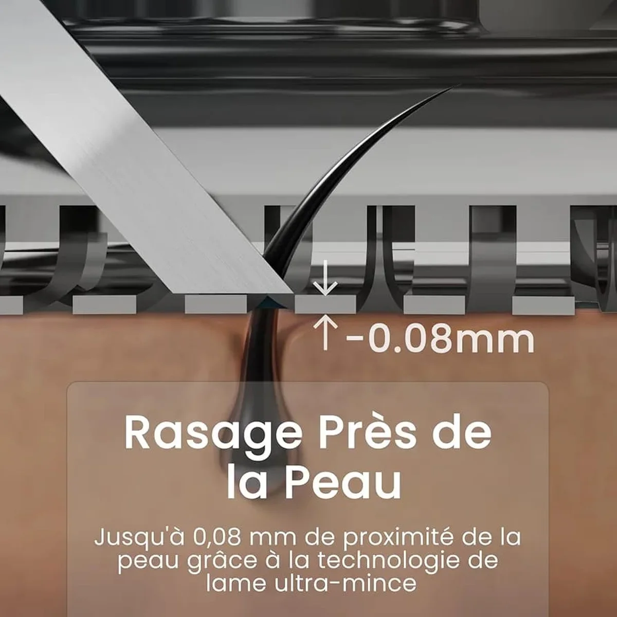 Grâce à la technologie de lame ultra-mince, les têtes rasent à seulement 0,08 mm de la surface de la peau. Le résultat est un rasage d'une précision professionnelle, sans rougeur ni sensation d'arrachement.