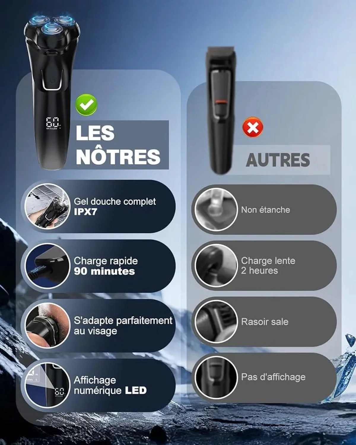 Là où les rasoirs classiques manquent d'étanchéité, d'affichage et de vitesse de charge, ce modèle coche toutes les cases. IPX7, charge rapide 90 minutes, têtes adaptatives et écran LED : aucun compromis.