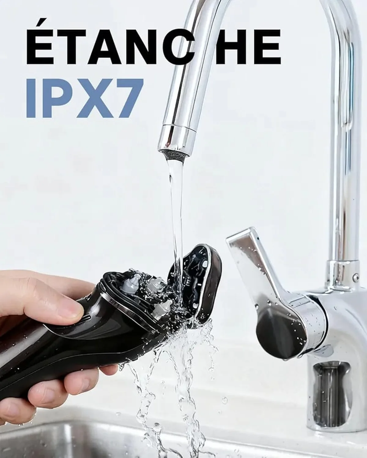 - Etanche IPX7 certifié — utilisation à sec, avec gel/mousse ou directement sous la douche