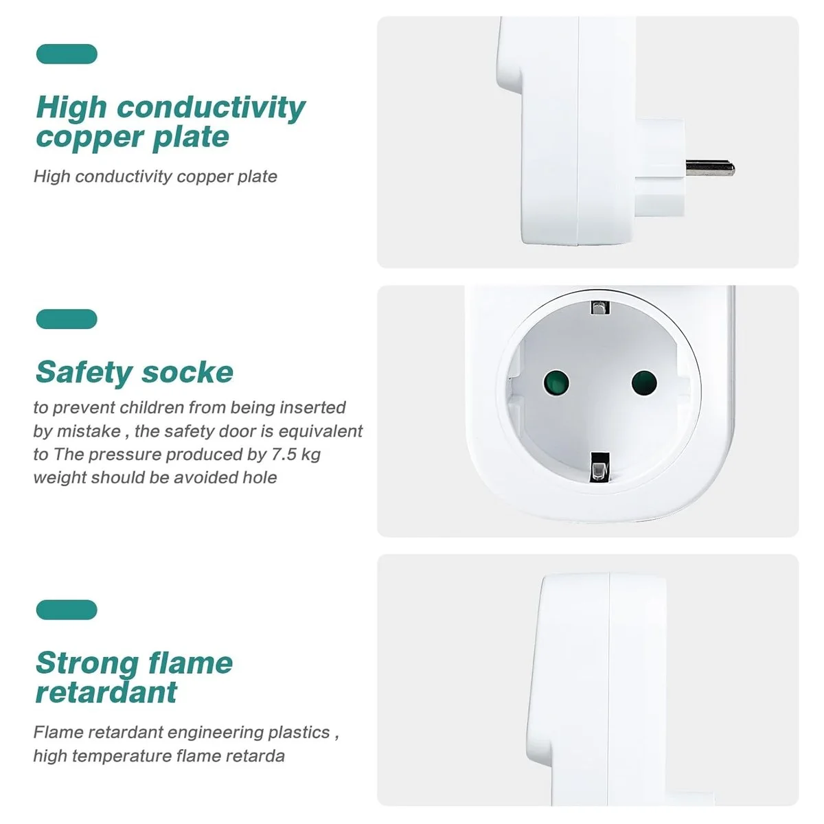 - Protection triple : surtension, sous-tension et surintensité sur une seule prise