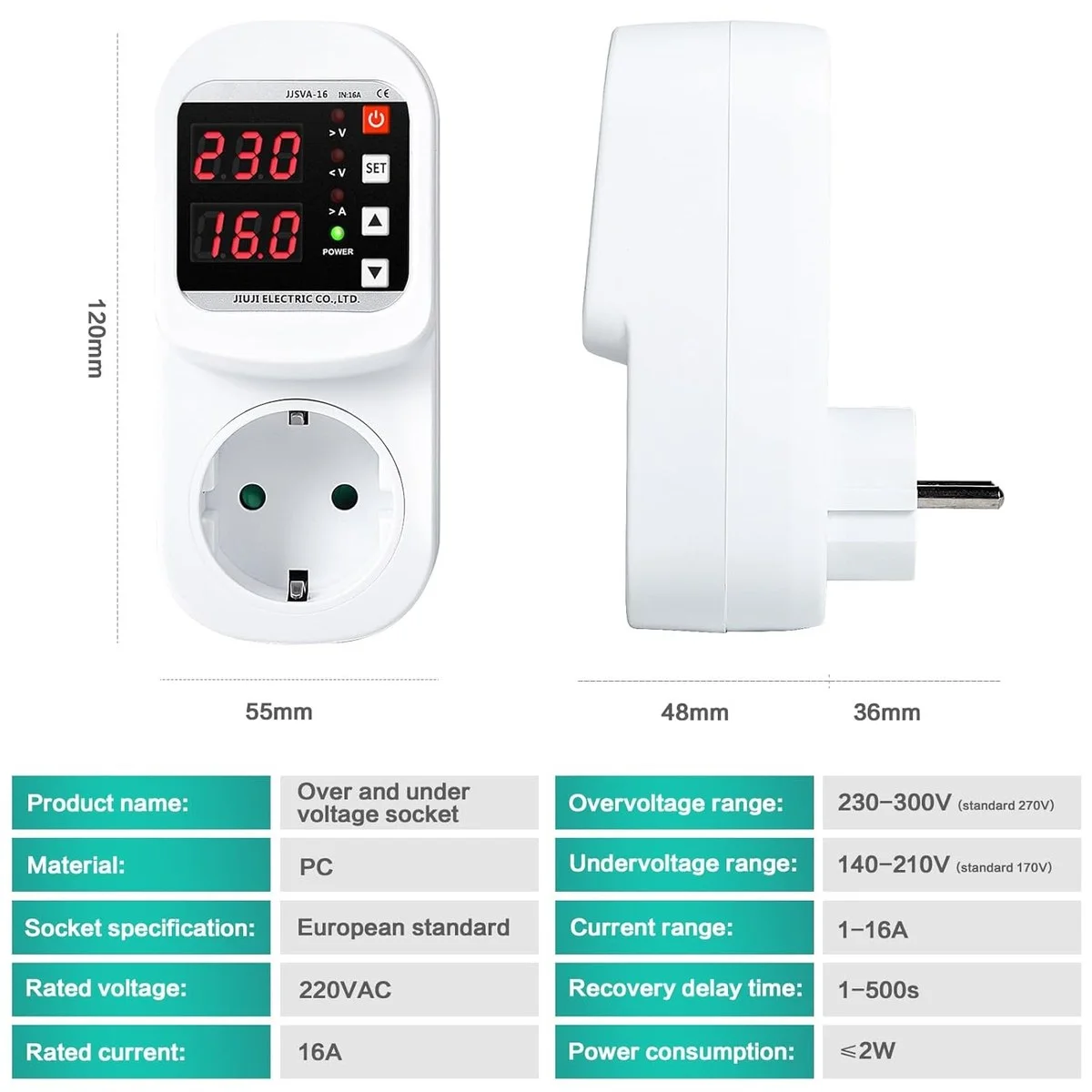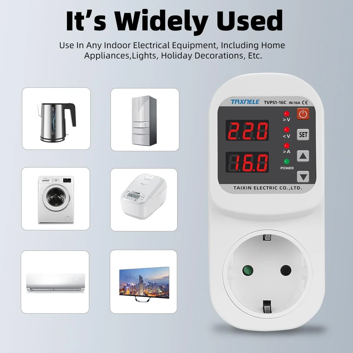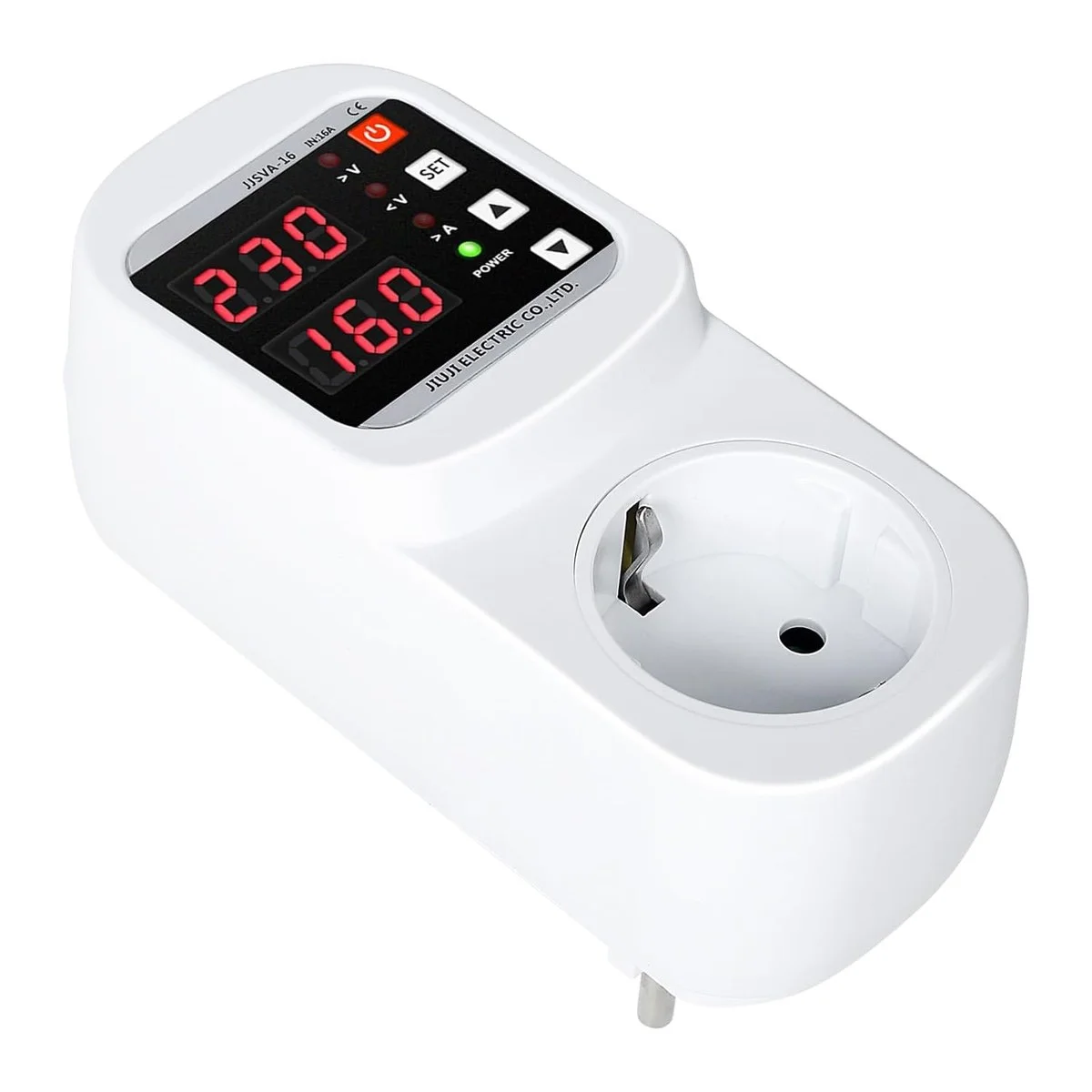 Protecteur de Tension Intelligent 16A — Prise EU Réglable, Afficheur LED, Protection Surtension Sous-tension et Surintensité