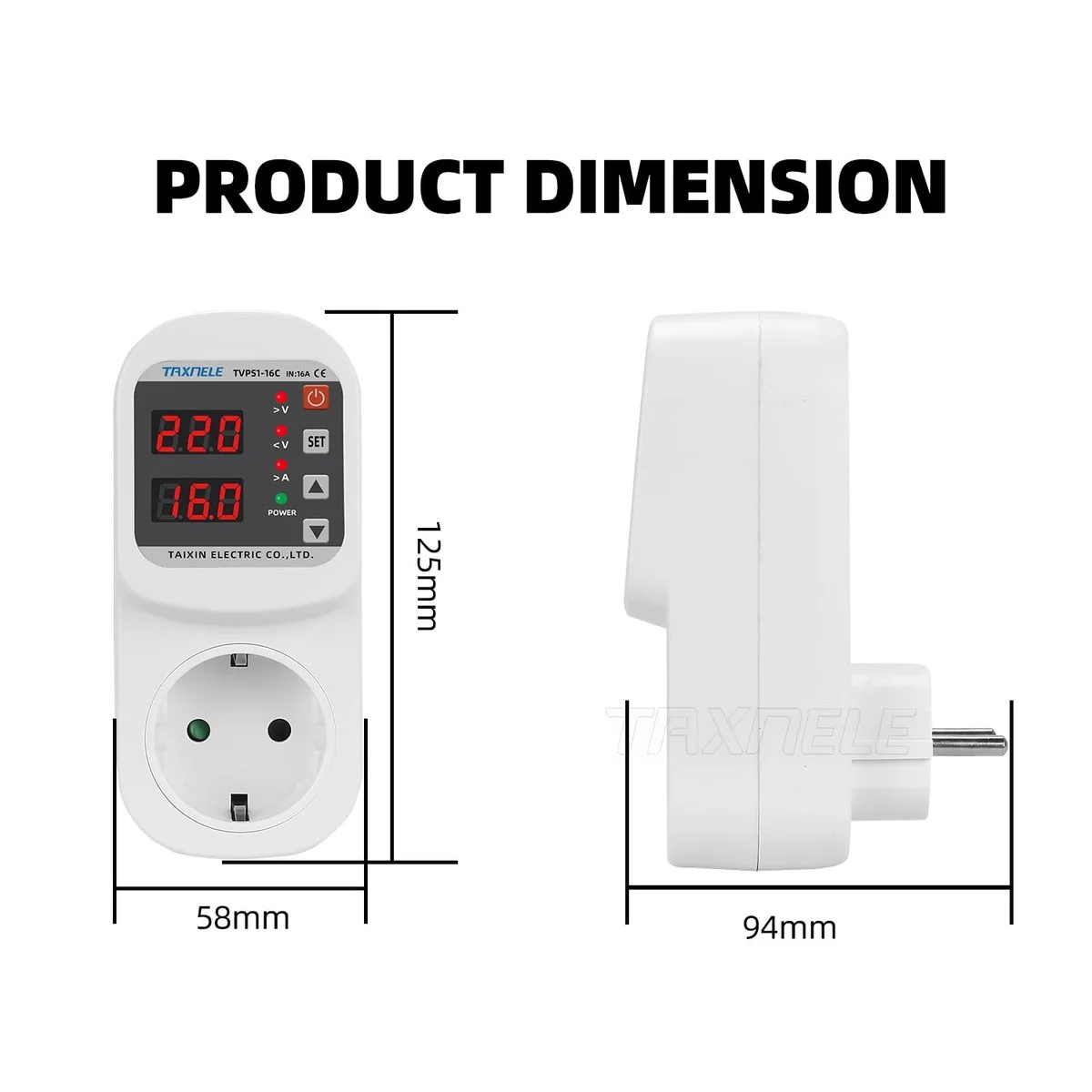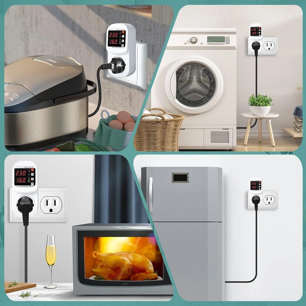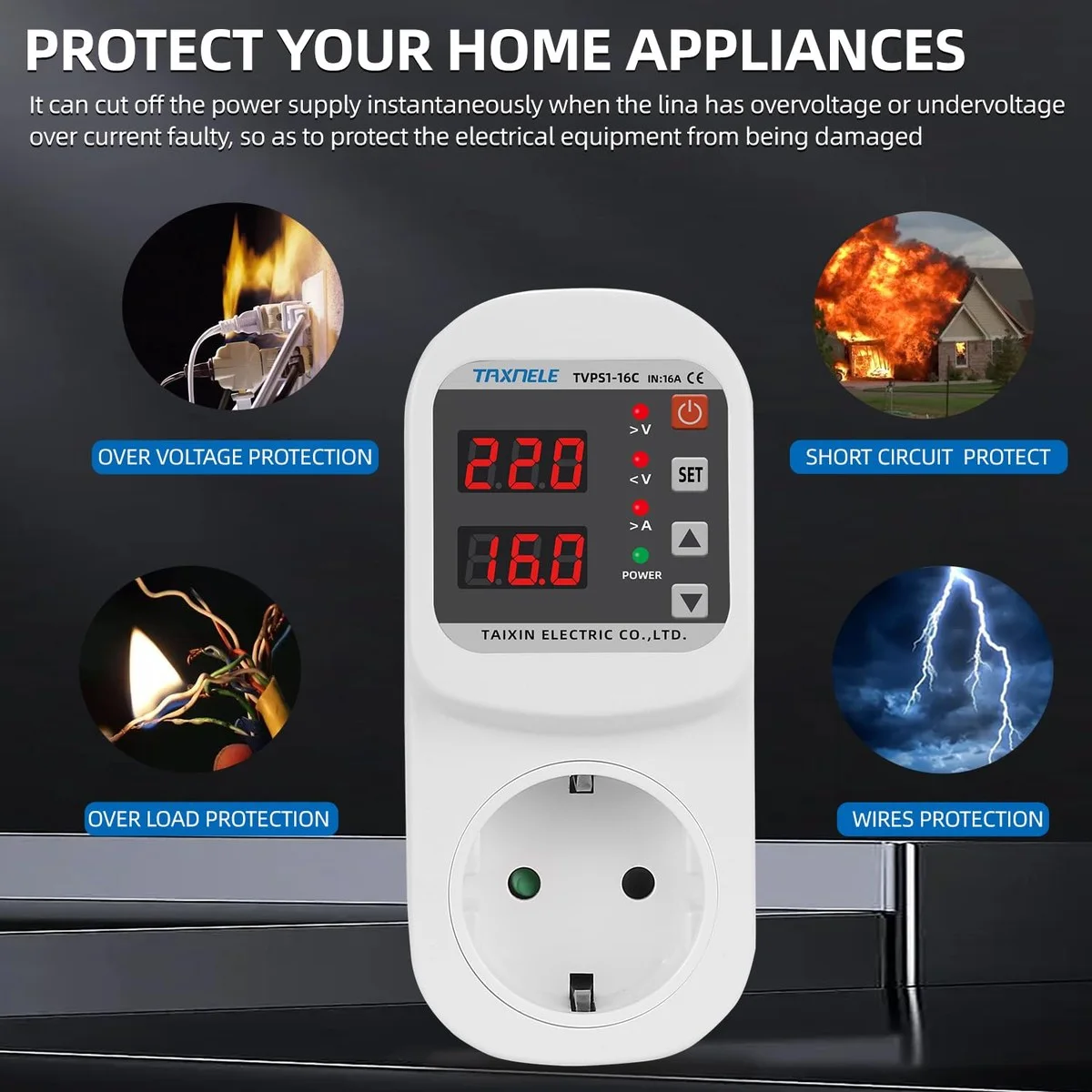 Protecteur de Tension Intelligent 16A — Prise EU Réglable, Afficheur LED, Protection Surtension Sous-tension et Surintensité