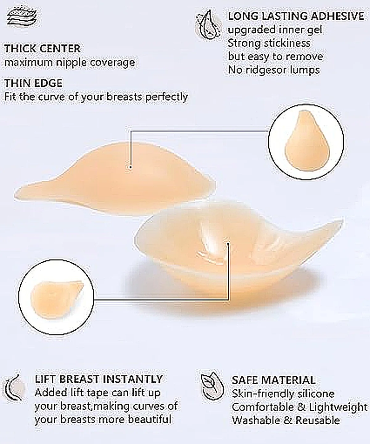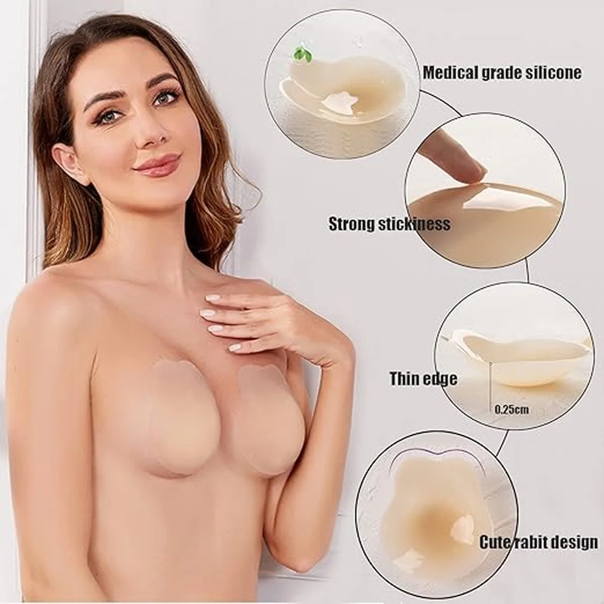 Fabriqué en silicone médical hypoallergénique, ce bra adhésif est sans danger pour tous les types de peau. Son bord ultra-fin de 0,25 cm épouse parfaitement les courbes sans marque visible sous les vêtements.